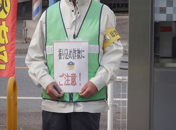 12月も近付きましたし、年末に向けての防犯対策の一つとして「振り込め詐欺」の注意喚起をしておられますこの方を画像に納めたいなぁ〜とかなんとか考えていましたように思います。