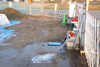 基礎部分は結構深く掘ってありまして、この部分にタップリと水道水が溜まっていますから、昨日からの垂れ流しと容易に想像されてしまいます。