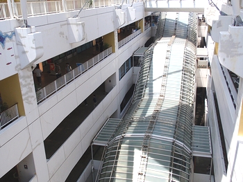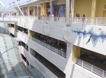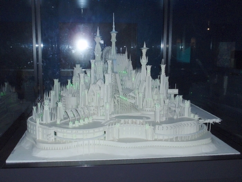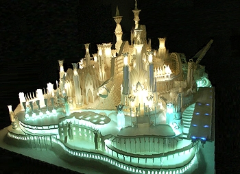 この作品は紙だけを素材に、東京藝術大学・学生の伊藤航(わたる)さんが「海に浮かぶお城と街」をイメージして製作した大型模型です。銀座の画廊に展示されていましたが、展示後の保存先を探しているとのことだったため、関係者の間で協議した結果、「海に浮かぶお城と街」というイメージが、東京湾に浮かぶ海ほたるパーキングエリアにふさわしいのではないか、ということになり、展示が決まったものです。