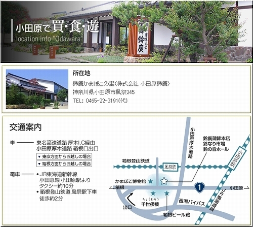 箱根芦ノ湖や熱海へも車で約40分など、気軽に立ち寄れる観光&おみやげ・食事スポットです。また、電車でお越しの方も、箱根登山鉄道「風祭駅」下車徒歩2分と大変便利になっておりますので小田原・箱根観光に是非お立ち寄りください。