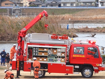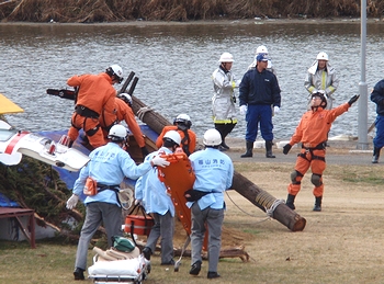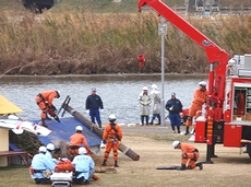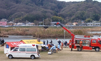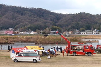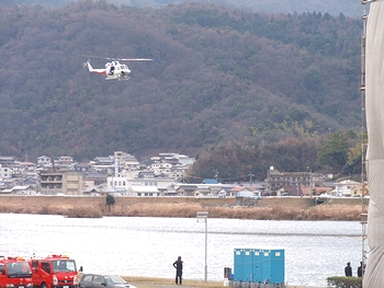 空からの放水とか、芦田川の中州をビル屋上に想定し、この中洲での救助活動…毎回見慣れましたこの訓練風景ですけど、にも拘わらず毎回、次から次にとカメラを向けますGONsanなんであります(^.-)☆