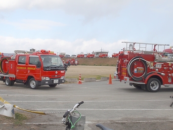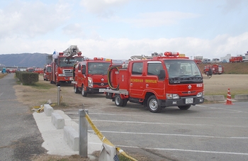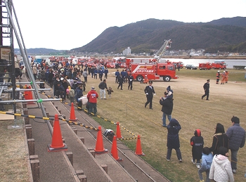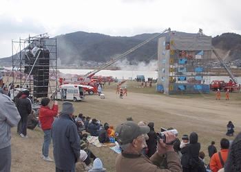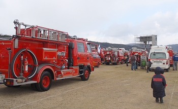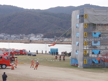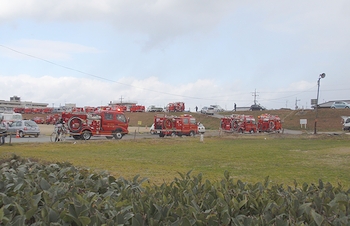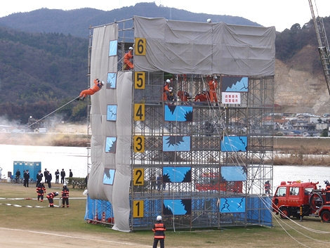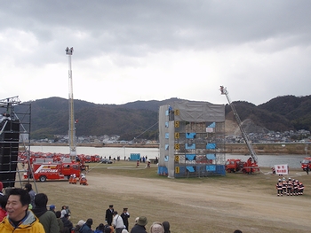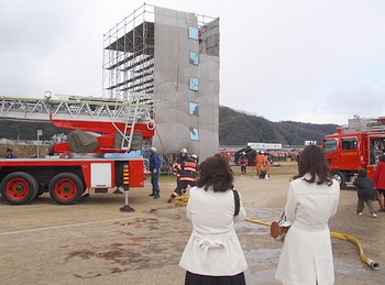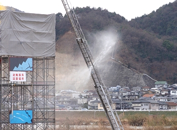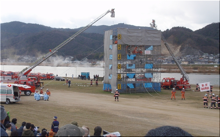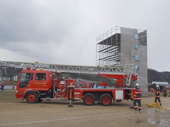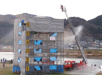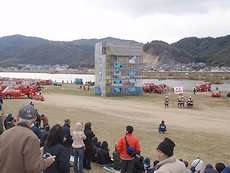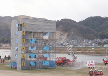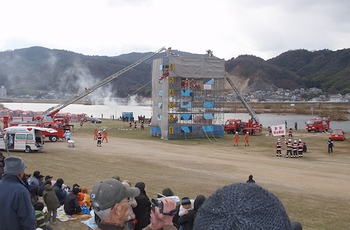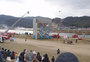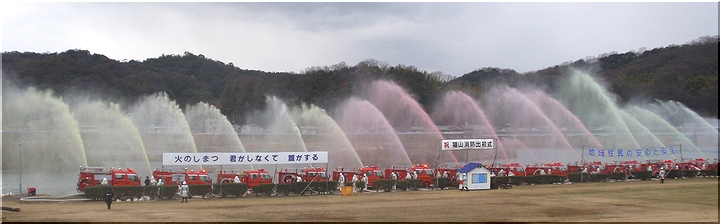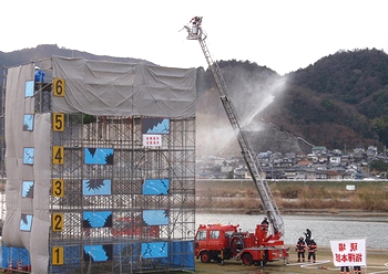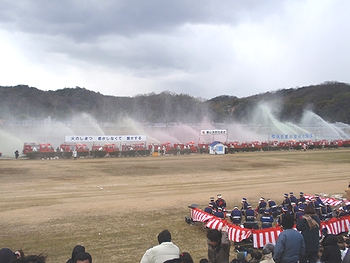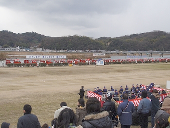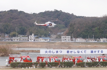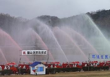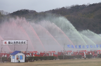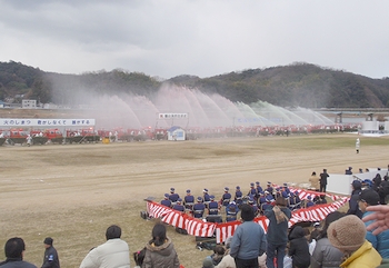 三原市の出初め式は和田沖町の三菱和田沖グラウンドであり、約1,100人が参加した。消防団対抗の放水競技のほか、消防署員らが人命救助を実演。広島県の防災ヘリコプターも応援に駆け付け、一斉放水などをした。
