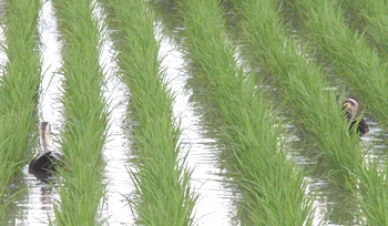 以前にも見掛けましたカモsanなんでしょうけど、何故かこの田んぼが好きみたいですネ(^.-)☆ゴンchanとGONsanのスグ近くにいたのですけど、カメラを向けましたらクルッと2羽とも反転。