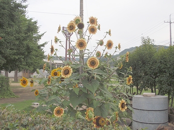 涼しいせいなのでしょうか…それとも暗い中での散歩は嫌いなゴンchanですから、暗くならないうちにサッサと帰りたかったのでしょうか…とにかく足取りの軽いゴンchanでありました(^.-)☆でも、運動公園内の市営プールと多目的広場の間に存在します花壇のヒマワリに眼が止まりまして暫し休憩のGONsan。