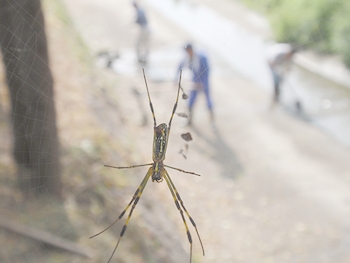 何気なくクモを1匹画像に納めましたけど、その後方にはまだ土砂除去作業をしておられます方々も。水呑川の土砂は土手の上に上げ車に積みますのも大変ですから、土手下の隅に何ヶ所かに分けて集めておきまして、撤去は市の港湾河川課にお願いです。