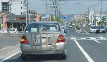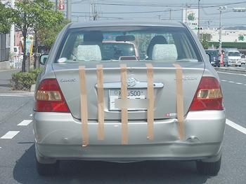 何気なくボケッと走行しておりまして、ふと前方の車を注視しますと、車輛後部にガムテープを貼り付けました車がそうこうしておりました。んっ?!いつの間にGONsanの前に…