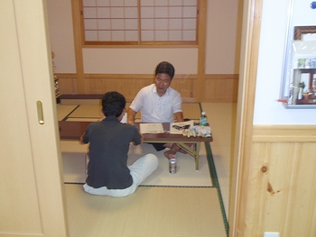 それで、急いで弟子の育成で、私達が御輿磨きをしています間に先生と生徒(右側)sanは音頭の練習。御輿磨きは毎日P.M.9:00までですから、この時間が近付いて来ますと、練習の成果を皆の前で発表となります。