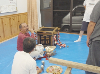9/12(土)に御輿の担ぎ方・ロープの締め方講習会で、今回は我が町内の御輿を使用。