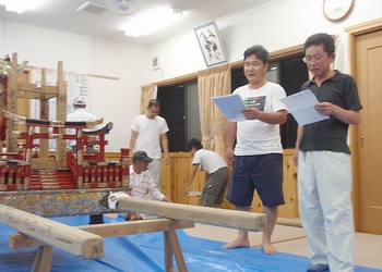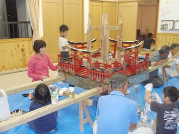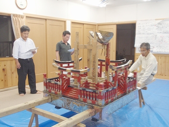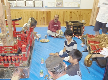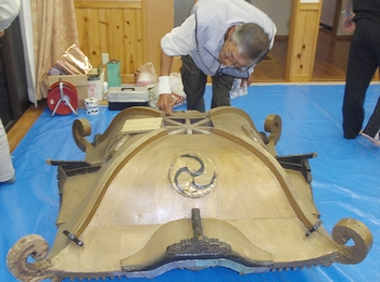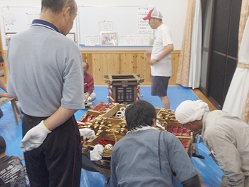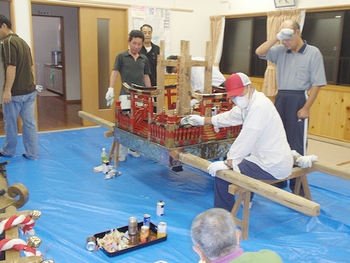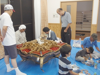 で、御輿磨きに集会所に集まられた方達は、さすがに少々少なめでありました。人数は少なくても、御輿磨き・修理は続きます(^.-)☆