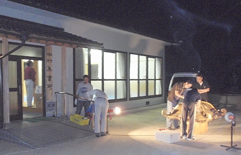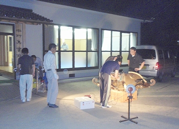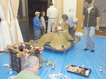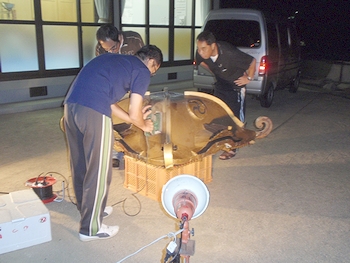 そして、P.M.7:40頃からは御輿磨きでまたまた集会所行き。集会所では、御輿の屋根部分を駐車場に持ち出し、グラインダーで研磨中。