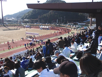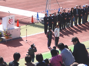 開会式の様子をスタンドからズッと眺めておりますと、そのうち天満屋女子陸上競技部の2選手が紹介されました。
