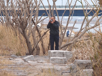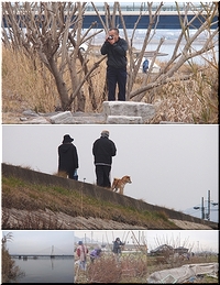 その当時には、毎日、朝、昼、晩…と、しょっちゅうパトカーが走行しておりまして、このお陰で空き巣の被害は聴かなくなりましたけど…日頃、別に悪い事をしていなくてもパトカーが眼に入りますとトギッとしたものですけど、この時ばかりは大変心強い感じのパトカーでありました(^.-)☆挿入の画像の上段は、先月あたりからこの護岸でよく見掛けます男性。