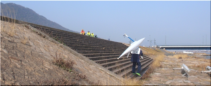 退社が少し遅れましたのがその要因ですけど、テニスコート横の土手を河口堰にと向かい、河口堰を渡りますといつものように芦田川大橋方向に走っていますと、前方から懐中電灯の灯りが四つばかり近付いてきます。
