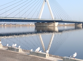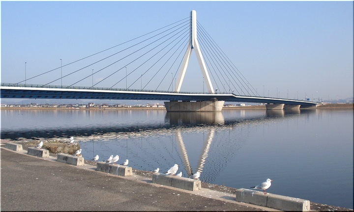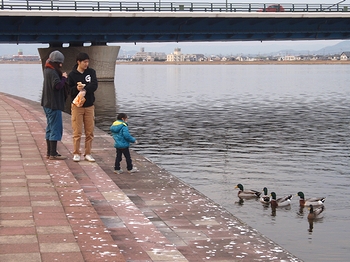 この場所を通り過ぎまして川上方向にと進み、暫く経まして振り返ってみましたら、子供さん連れのご家族がヤッて来られまして、その上空を先ほどのカモメさん達が賑やかに飛び交っておりました。餌をくれる人…全くくれない人…と、カモメさん達はよく理解しておりますよ(^-^)ところで、白くてキレイなこのカモメ達なんですけど、よくよくジックリ見てみますと、顔は決して可愛くは無いのですよ(^-^)
