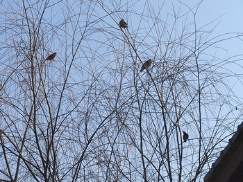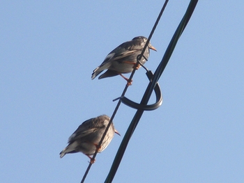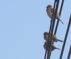 電線に止まったり樹木の枝に止まったり、そして仲間同士でじゃれ合ったり…と実にせわしく騒々しい連中です。天気もイィし温かそうですし、仲間と遊んでいましたのでしょうねぇ〜こぅして樹木とか電線に止まっています鳥を眼にしていますと、時々不思議に感じます事も…