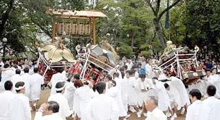 白装束に身を包んだ約250人が、計4基のみこしを担いだ。1基の重さは300〜500キロ。もみ合いながら円陣を組む男衆の周りを、担ぎ手が「わっしょい」と掛け声を上げながら互いを追いかけ回した。