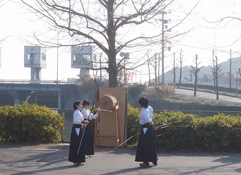弓道場の外の広場では、今から高校生の3人が練習開始…と言ったところ。