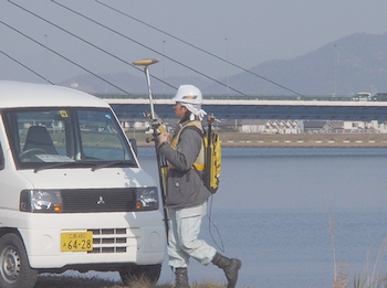 ゴンchanの歩行に従って陸上競技場を一周し市民球場を通り過ぎ、またウォーキングロードにと戻って来まして、何気なく芦田川の土手に眼を向けますと、対岸とこちら側で測量をしておられます方のお姿が…