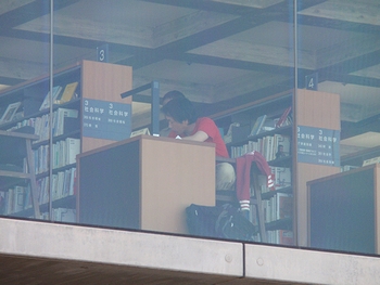 この公園内には「学びの館ローズコム(福山市中央図書館・生涯学習プラザ)」がありまして、その建物の壁面に眼を向けますと、来春の受験生の方達なんでしょうか…中央公園内の賑わいには眼もくれず、黙々とお勉強しておられます方のお姿が(^_^)v