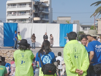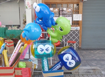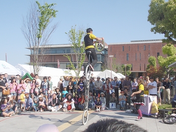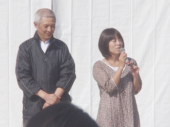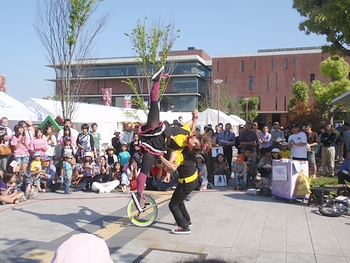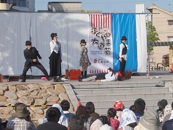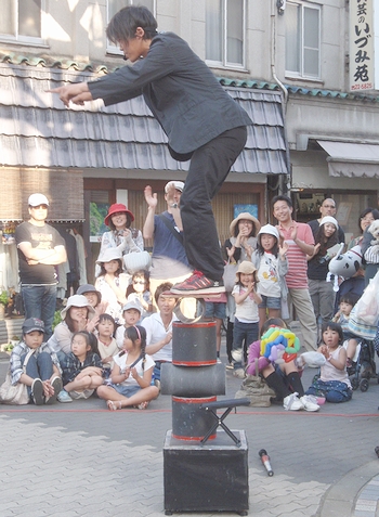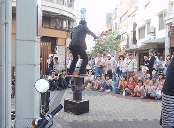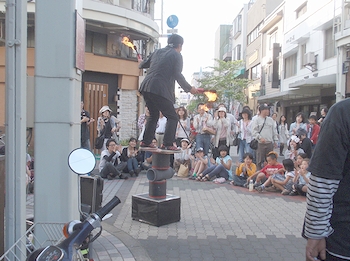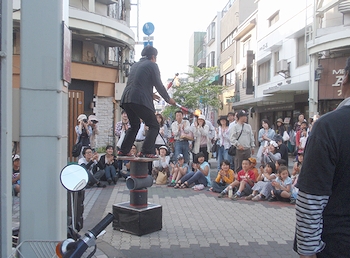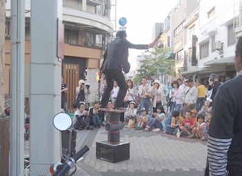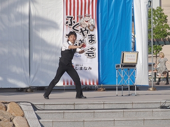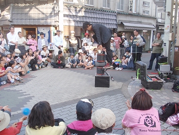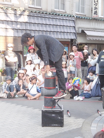 中央公園にお別れし霞町商店街の一角に出ますと、ここでもパフォーマーがお一人奮闘中(^_^)v