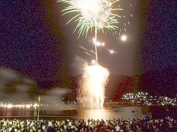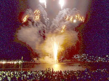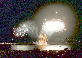台船から尾を引きまして打ち上げられ、大きく開きました花火を画像に納めたいのですけど、近すぎてそれは無理。