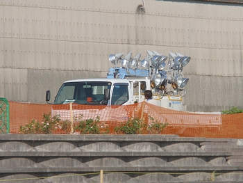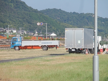 搬送のトラックは既に来ていますけど、クレーン車はまだ来ておりません。