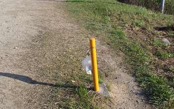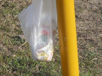 ハローズの駐車場も横断で、運動公園入口の進入禁止のチェーン張りポールに眼を向けますと、このポールには空き缶・ゴミが入りましたビニール袋が掛けられておりました。