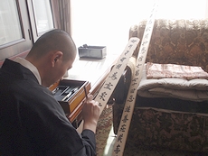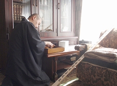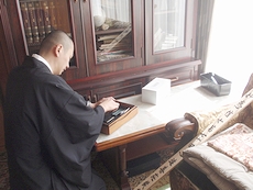 持参されました塔婆を手に、まずは仏壇の前に向かわれましたお上人。
