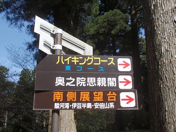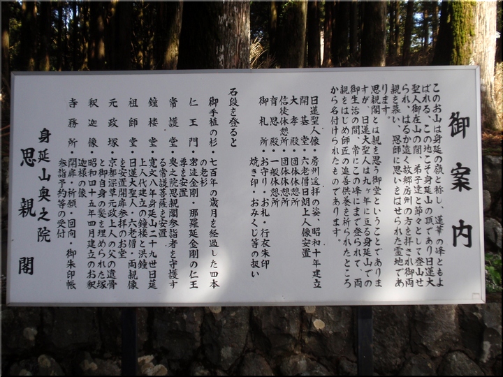 久遠寺の裏山が身延山で山頂は、海抜1,153mあります。ここは日蓮聖人が登山せられ、故郷である千葉県小湊のご両親様を偲び、追慕された霊跡の地でありますので、思親閣が建てられ奥ノ院と呼ばれております。