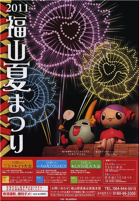 もぅ1ヶ月も前の事となってしまいましたけど、お盆の『2011福山夏祭り“あしだ川花火大会”』を話題に綴ってみたいと思います(^.-)☆今年の4月に、嫁さんの母親の一周忌法要で福井に出かけました際に、嫁さんの姪が「福山の花火大会、大変キレイですネ(^.-)☆一度、観てみたい…」との事で、「んっ!?」のGONsan。