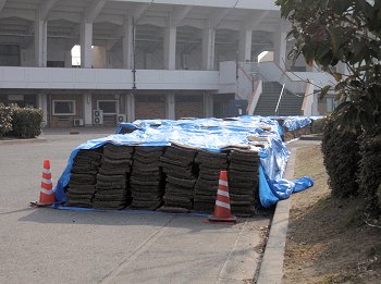 陸上競技場正面入り口付近にとヤッて来ますと、今度は駐車場の一角に芝生が積み重ねられておりましたから、またまた眼が向いてしまいました(^-^)