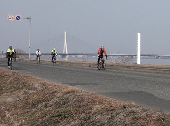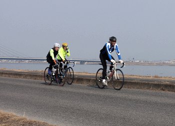競技場を一周し、土手際の遊歩道に上がりますと、日曜日の午前中ですから、いつものメンバーが自転車の練習の真っ最中(^_^)v
