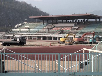 何ヶ所か陸上競技場内を覗けます場所があるのですけど、そこから内部に眼を向けますと、なんとここでもまた工事中。