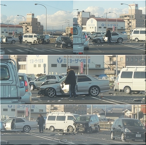 | ■2011年02月20日 衝突事故…何度見かけましても怖いですネ(^-^; ![]() もぅ随分前の事となってしまいましたけど、これはいつの出来事でしたか… 画像のデータを誤って消してしまいまして、撮影日がいつでしたか定かではありませんけど、確か、土曜日の勤務を終え帰路の一光景だったように思います。 土曜日なのに、何故かヤケに渋滞しているなぁ〜と少々不思議。 でも、急ぐ必要もありませんからノンビリと渋滞に巻き込まれておりましたGONsanです(^-^) ヤッとT字交差点に出まして右折しましたら、なんと数台の車の衝突と言うか接触事故が発生しておりました。 まだ警察の事故処理車が到着してはおりませんでしたから、事故発生後あまり時間は経過していない様子。 これをイィ事に、通りすがりに2枚ばかりパチリ(^.-)☆ 画像に納めますのに精一杯で、事故現場をしげしげと眺める事もなく通過となってしまいました。 こぅして後で画像に改めて眼を通してみますけど、何台の車の接触事故でしたのでしょうねぇ〜 少なくとも4台はぶつかっていましたように見えましたのですけど… 5台のようにも見えましたかも… 交差点内でもありませんし、交差点手前の小さな橋の上ですから、どぅしてこんな衝突の発生が… 交差点に突入前に信号が黄色にでも変わり、その際、先頭の車が急停車?… それにしても交差点よりは少し手前の位置ですから、そぅでもなさそうですし…一体どぅして?! 車輌の接触面は大破ですから、スピードは結構出ていましたのかも… 事故発生の要因はともかく、とにかくこんな衝突・接触事故は、通りすがりに眼にしましただけでも随分怖く感じられてしまいます。 ドライバーのお一人が、どちらか電話しておられましたけど、他のドライバーsanは何処に?… こぅした事故現場を眼にしますと、決して人ごとでもありません。 明日は我が身か…の想いも湧きますから(^-^) どんな事故でありましても、何度目にしましても、こんな接触事故は本当に怖いものでありますネ(^-^)//" |