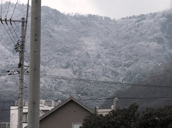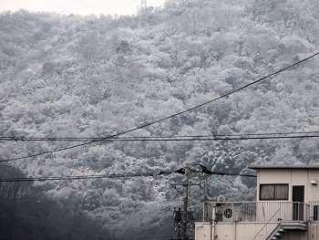 翌朝は、2/11・建国記念日の祭日ですから、何時頃でしたか…戸外でタバコを吸いながら山際に眼を向けますと、木々がうっすらと雪化粧で ありました(^.-)☆