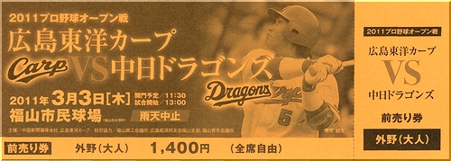 先日、中国新聞販売店sanからオープン戦「広島×中日」戦のチケットが届いておりました(^.-)☆