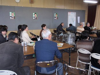 横断幕の取り付け、パイプ椅子の設置、議員先生のポスター貼り…と、皆さん手慣れておられますから30分少々で無事終了。