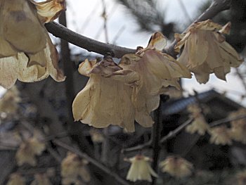 先日の日曜日でしたか…集会所での町内会会合に出かけます際に、ノンビリと歩いておりまして眼に入りましたのが既に枯れていますロウバイ(蝋梅)でありました(^.-)☆