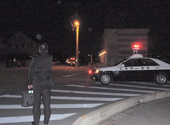 そして、メイン通りには戻らず一本西側の裏の通りから我が家に向かい、最初の四つ角で徐行しメイン通り側に眼を向けますと、ここにもパトカーが停止中。