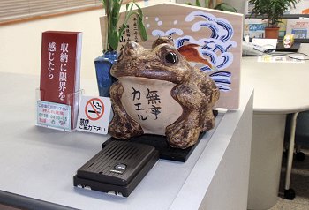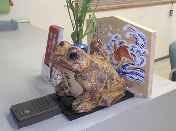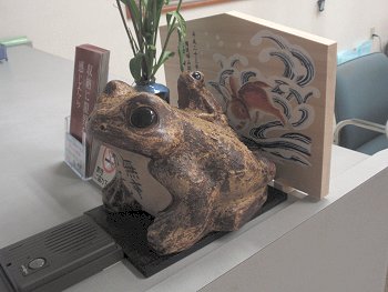 某会社事務所の受付カウンターの上に、カエルの親子の置物が(^.-)☆