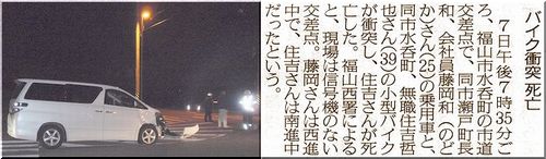 ■2011年03月09日![]() 我が家近くの交差点で衝突事故が発生しておりました(^-^;B 一昨日の事故の件、昨日の朝刊への記事掲載はありませんでしたけど、今朝の中国新聞sanの朝刊には掲載がありました。 う〜ん、バイクの男性…お亡くなりになられたのですねぇ… 事故当日の野次馬の皆様のお話しでは、随分危ない状態でしたようですけど、やはりお亡くなりになられましたのですねぇ〜 お悔やみ申し上げます。 男性のお歳は35歳くらい…と耳にしておりましたが、39歳とのこと。 まだお若いのに、実にお気の毒であります。 一方、ワゴン車のドライバーsanは25歳ですから、一層お若い方なんですネ… 事故発生の要因が何でありましたのか、GONsanには知る由もありませんけど、ワゴン車の女性もまた大変お若い方でありました。 バイクは地元・水呑町にお住まいで、女性の方は瀬戸町の方。 何か所用でお忙しかったのでしょうか… 事故…本当に怖いものであります。 お互い、車の運転には充分留意したいものでありますネ(^-^)//" |