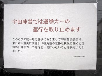 東日本大震災に伴います被災地の悲惨な状況の中での選挙戦ですから、選挙カーの運行を取りやめられました議員先生。