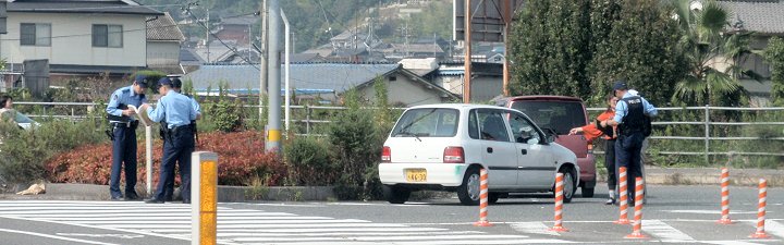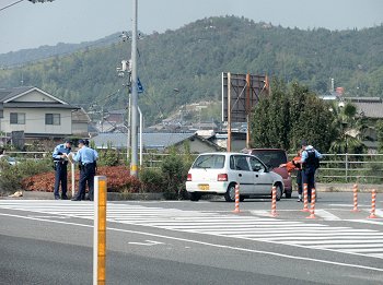 我が家を出まして間もなく赤坂バイパスに入りますと、信号待ちの際に後方から追突でもされましたのでしょうか…2台の車が分離帯付近で停車し警察官の取り調べの真っ最中(^-^;