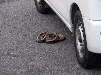 バスから降りて歩いておりますと、車の脇に脱がれた一足のつっかけが眼に入りました(^-^)