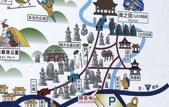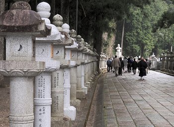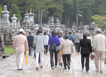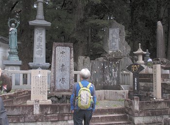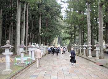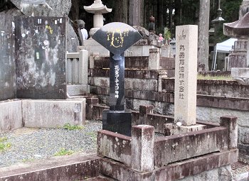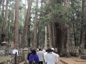 結局、傘持参派、傘持たない派は半々でしたけど、GONsanは傘不要派でありました(^.-)☆奥の院までの往復はガイドsan付きでの歩行となりましたけど、ユーモア交えました軽妙な語り口のガイドsan。さすがプロのガイドsanならでのご案内で、仲々楽しい奥の院までの道のりとなりました。WEB上で検索しますと、高野山奥の院に関してのこんな記載が。■高野山・奥の院高野山は、紀州「紀の川」の南方、海抜約900mの山上にあり、東西6km、南北3kmの、周囲を八葉蓮華になぞられた峰々に囲まれた、一大仏都である。真言宗の開祖空海(弘法大師)が、桓武天皇の勅許を得て、延暦23年(804)唐に渡り、唐の長安において、唐の国師である青龍寺恵果阿闍梨から真言密教を授かり、2年後帰朝してここに開山した。帰朝の船中から、師より授けられた三銛(さんこ:仏具)を空中に投げ、「伽藍建立の妙地を示し給え」と心に念じたところ、三銛は高野山の松の樹に掛かって、まばゆいばかりの光を放っていた。それを見た空海は、この地こそ真言密教の修禅にふさわしい地であるとして開山を決意した、と伝わる。そして弘仁7年(816)太政官符をもって高野山の地を下付され、翌弘仁9年、空海は高野山に登り七里結界の法を修め、現在の大塔の地を中心に伽藍地鎮の式を執り行い、大塔・金堂をはじめ諸堂、僧房の建立を開始し、伽藍を中心とした一山を「金剛峯寺」(こんごうぶじ)と命名した。密教とはその名の通り秘密の教えである。一般には公開されない秘密の教えを含んだもので、一人の師匠にただ一人の弟子がついて教えを請い、遣唐使で唐に渡って密教を学んだ空海は、帰国後、密教を体系的に整理し「真言宗」を一般の人々に広めた。高野山は、遣唐使として唐へ渡った空海(弘法大師)が開いた真言密教の根本道場である。高野山は和歌山県伊都郡高野町にあり、町全体は山に囲まれている。国道24号線から高野山道路を登っていくと、大門に始まり金剛峰寺を経て空海の眠る奥の院御廟まで、道路の両側に寺院が建ち並ぶ。標高800メートル、周囲を深山に囲まれ東西5.5キロ、南北 2.3キロの山上盆地だ。弘法大師・空海は20歳で出家し、31歳の延暦23年(804年)、唐に渡り、都・長安で恵果和尚より正統密教をきわめ、8人目の阿闍梨遍照金剛の称号を得、大同元年(806)に帰国してから、真言密教を全国各地に広めた。日本のあちこちに弘法大師逸話が残っている。嵯峨天皇より高野山を賜り弘仁7年(816)開山、これが高野山金剛峯寺の初めと言われている。それから20年後、大師は62歳の承和2年(835)3月21日に入定し即身成仏となり、今も奥の院御廟に葬られている。空海の死後も、高野山自体は勢力を伸ばし、戦国時代には相当の所領(約16万石)を有した寺領権力となった為、織田信長はこれを焼こうとしたが果たさずに本能寺で果てた。高野山は豊臣秀吉に屈し、所領2万石33万坪を安堵されて生き延びる。徳川時代も幕府の庇護の元に、諸大名達の墓所として栄え今日に到っている。金剛峰寺は霊宝高野山の総本山として栄え、現在では全国に4,000余りの末寺を持つ。大広間、柳の間(豊臣秀次は、ここで切腹した)、梅の間等々の部屋には、狩野元信、探幽、探斉らの襖絵があり有名である。本坊以外にも、別殿、奥殿、新書院、茶室等の建物があるが、現在の本坊は、文久3年(1863年)に再興したもので文化財となっている。即身仏となった弘法大師の御廟には、灯明、お香、読経が絶えることなく捧げられる。全世界1,000万の信者達は、ここを聖壇としてあがめ、毎年100万人以上がこの高野山を訪れる。現代では、高野山の墓所を利用しているのは大名達ではなく企業である。Panasonic、SONY、SHARP、日産、トヨタといった名だたる企業の社墓が新しい墓地園に建てられている。花菱アチャコや大河内傳次郎など、芸能人や有名人もここに墓がある。ロケット産業に強い明和工業鰍フ墓地もある。企業の墓は、トレードマークや社業を表した墓碑が多い。福助足袋は福助人形、飲料会社はコーラのビン、といった具合だ。日本写真家協会の墓は、写真業界に貢献した人々の顔写真が石に刻み込まれていた。一見写真を石に印刷したように見える。高野山は、時代が移り庇護者が変わっても、しぶとく生き残って行くに違いない。…と、こんな記載が(^-^)奥の院までの参道沿いの墓所に眼を向けます程度の時間しかありませんから、凡ての墓所を廻りますのはとてもとても…でも、まさにこんな参道周辺の光景でありました。