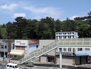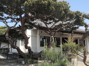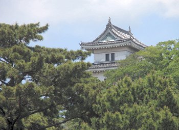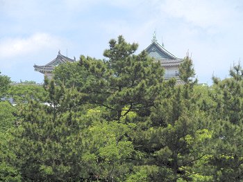 時間はと見ますと正午を少しばかり過ぎておりましたが、行程表通りにバスは走って来ましたようですネ(^.-)☆昼食を終え建物の外で一服しておりまして周辺を見廻しておりましたら、正面の松林超えにお城の天守らしき屋根が眼に入ってしまいました。