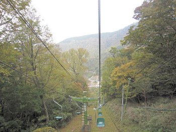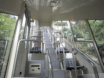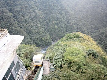 (左)ホテル祖谷温泉のケーブルカー (右)これで谷底の露天風呂へ