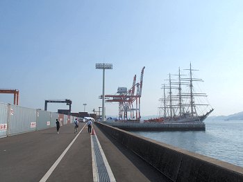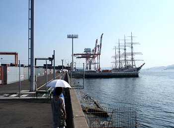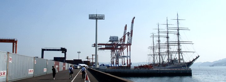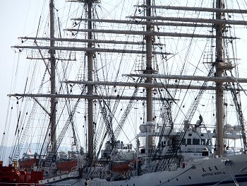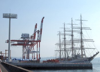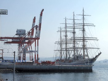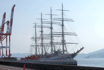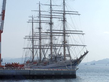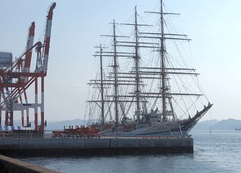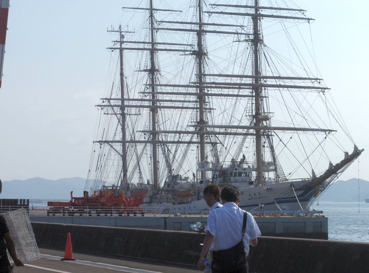 ■海の日に日本丸が福山に(^_^)v日付:2011/7/22(金) 1:26先日・7/16の中国新聞に、こんな記事の掲載がありました。■「太平洋の白鳥」福山寄港--- 2011/07/16 中国新聞 ---世界最大級の帆船の日本丸(2,570トン)が15日、福山市箕沖町の福山港国際コンテナターミナルに初めて寄港した。19日まで停泊し、17、18の両日には周辺で市制95周年の記念イベントがある。日本丸は、航海訓練所(横浜市)の練習船で、高さ約50メートルのマスト4本を備える。計36枚の帆を広げた姿は「太平洋の白鳥」と呼ばれる。この日は、清水海上技術短期大学校(静岡市)の学生たち169人を乗せ到着。大藤高広船長は「優美な姿を楽しんでほしい」と話していた。17日午後1〜4時に帆を広げる訓練を公開、18日は船内見学会がある。…と、こんな記事でありまして、帆を広げる訓練の光景は是非見物してみたい…との想いもありましたけど、この連休は畑の草取りに専念しなければなりませんし、見物は断念。