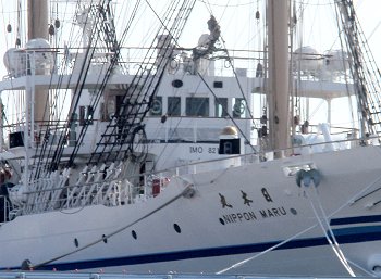 思わず振り返りますと、ふ〜ん、本物の関係者の方でありました(^-^)◆日本丸U世日本丸の後継として、1984年(昭和59年)に日本丸U世が就航した。日本丸U世は帆装艤装設計から製作まで、すべて日本国内で行われた初の大型帆船である。住友重機械工業浦賀工場で建造された。先代の日本丸に比べて帆走性能が大幅に向上しており、世界でも有数の高速帆船として名をつらねている。その年で最速の帆船に贈られる「ボストン・ティーポットトロフィー」を1986年、1989年、1993年と三回受賞している。なお、日本丸U世と姉妹船の海王丸U世(1989年就航)を見分けるための大きな違いは、舳先にある船首像である。日本丸U世の船首像は手を合わせて祈る女性の姿をしており、「藍青(らんじょう)」と名付けられている。海王丸U世の船首像は横笛を吹く女性で、「紺青(こんじょう)」と名付けられている。…と、こんな日本丸でありまして、今回福山にヤッて来ましたのは勿論「日本丸U世」であります(^_^)v