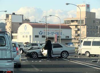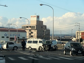 ヤッとT字交差点に出まして右折しましたら、なんと数台の車の衝突と言うか接触事故が発生しておりました。
